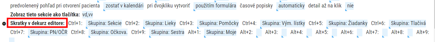 - sekcia - stlačenie skratky vloží namapovanú sekciu do dekurzu automaticky (napr.: diagnóza, výkon, recept)
