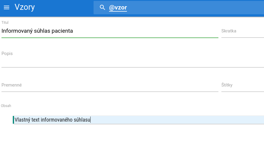 Východzí text pre informovaný súhlas pacienta viete zmeniť vytvorením vlastného vzoru s identickým názvom "Informovaný súhlas pacienta".