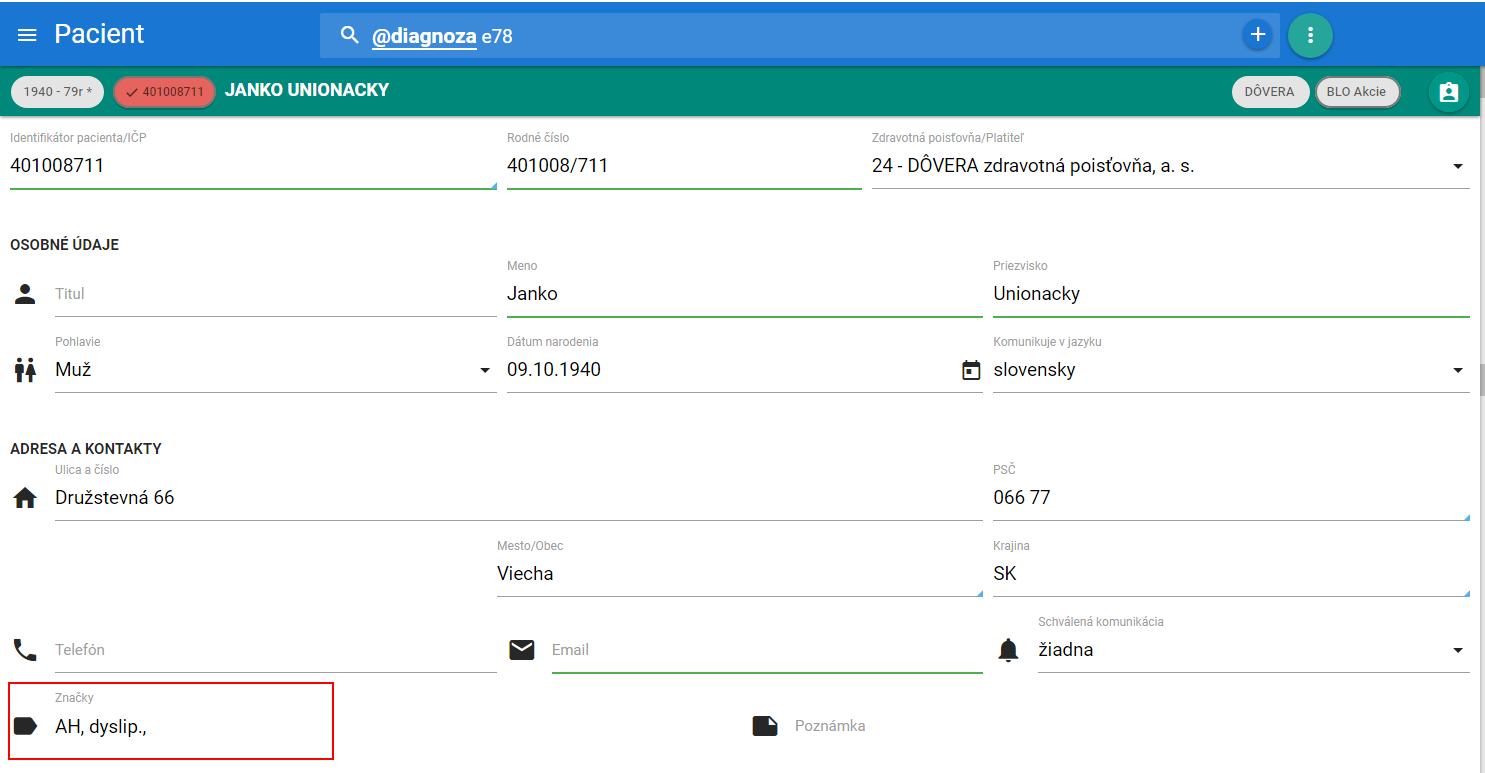 - do Údajov pacienta (pozri návod) sme pridali možnosť doplnenia Značiek