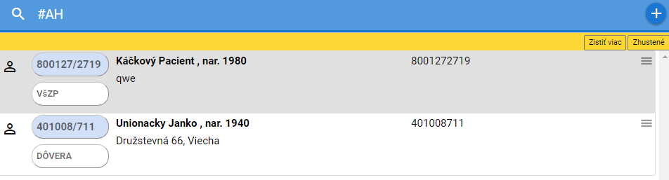 - ak vo vyhľadávacom riadku zadáte # (pravý ALT+X) a hneď za tým značku (napr. #AH), podľa ktorej chcete vyhľadať pacientov, program Vám vyselektuje všetkých pacientov, ktorí majú túto značku vo svojich údajoch uvedenú
