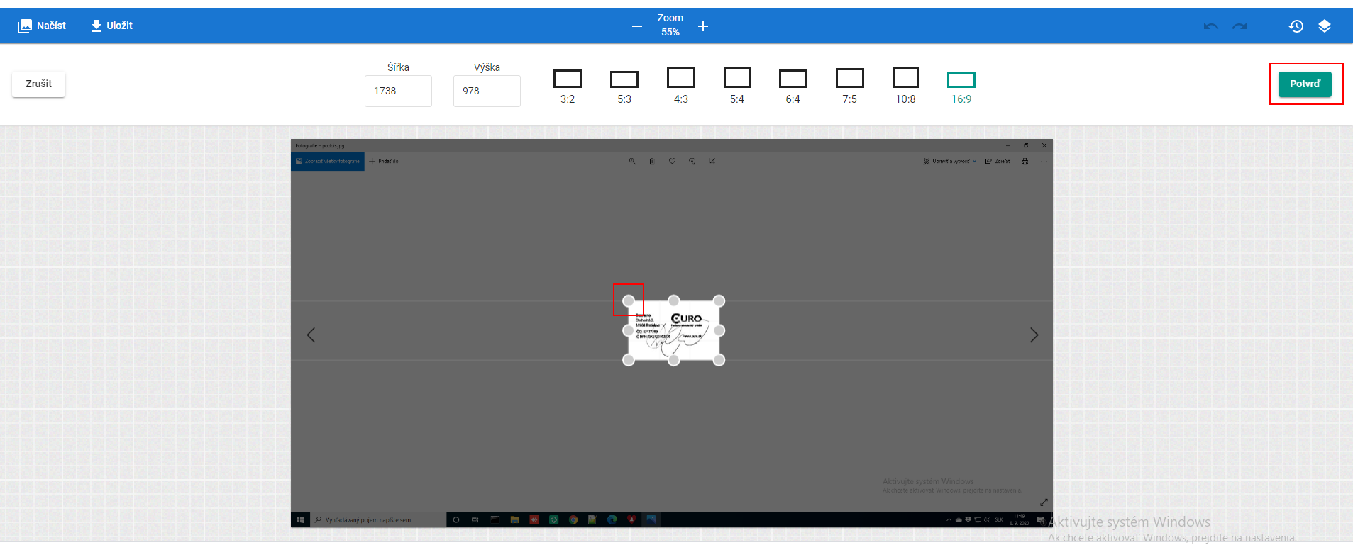 - pomocou ťahania guličiek, ktoré rámujú okraj obrázka, je možné zmenšiť ho na minimum a následne zmenu uložiť klikom na Potvrď v pravom hornom rohu