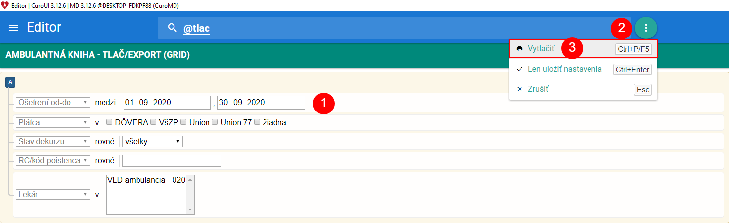- následne sa Vám otvorí Editor Ambulantnej knihy, kde si viete zadať rôzne parametre (napr. obdobie)