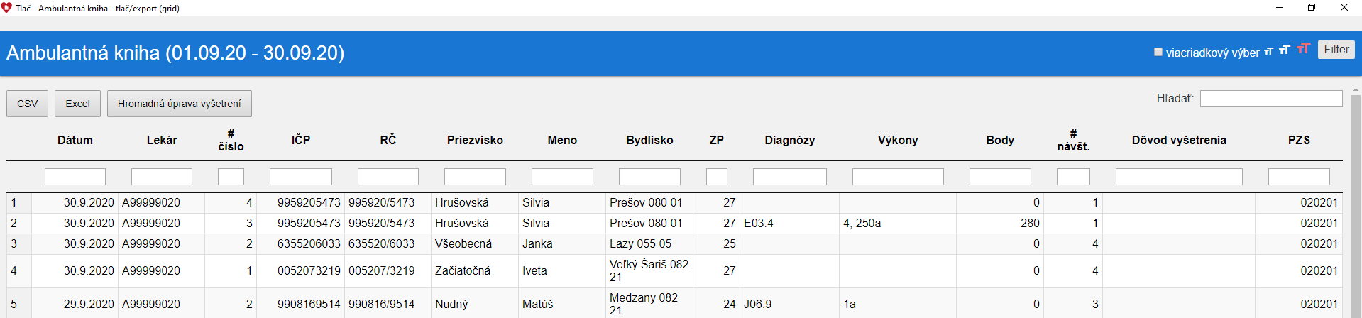 - pod každým názvom stĺpca Ambulantnej knihy je miesto pre zadanie konkrétneho filtra pre vyhľadávanie a Vy si viete takýmto spôsobom vyselektovať informácie, ktoré potrebujete (napr. nájsť pacientov s konkrétnou diagnózou)