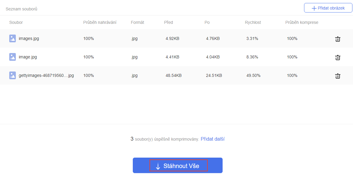- po ukončení komprimácie kliknite na Stiahnuť všetko