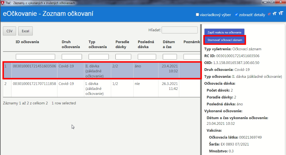- a potvrdením možnosti Stornovať očkovací záznam sa záznam vystornuje