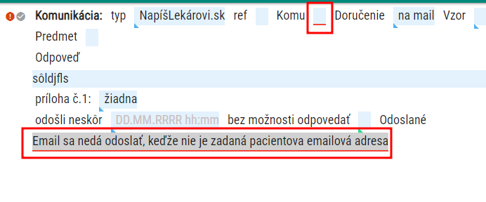 V prípade, že pacient nemá v Údajoch nastavenú emailovú adresu, po odoslaní sa zobrazí upozornenie