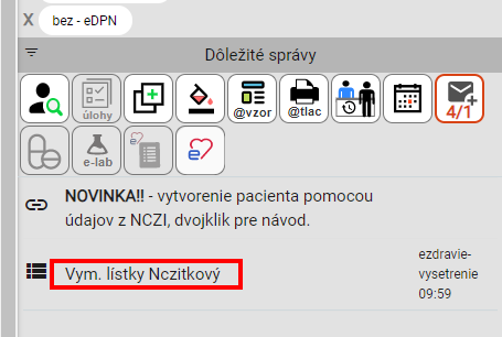 - po otvorení pacienta sa po chvíľke v Dôležitých správach zobrazí informácia(vtedy ak pacient má pre vašu špecilizáciu neprevzatý lístok) o Výmennom lístku, ktorý dvojklikom otvoríte