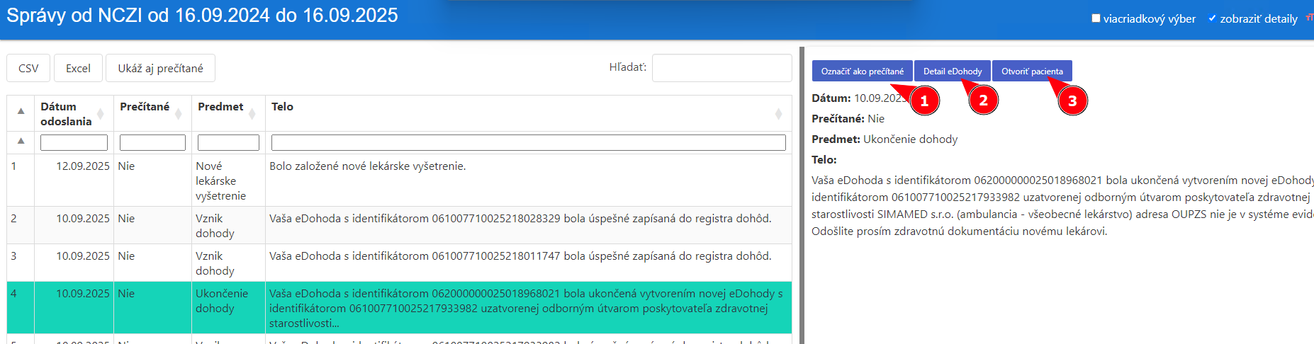 1. kliknutím na "Označiť ako prečítané" označíte správu ako prečítanú, následne sa v zozname ukáže ako prečítaná