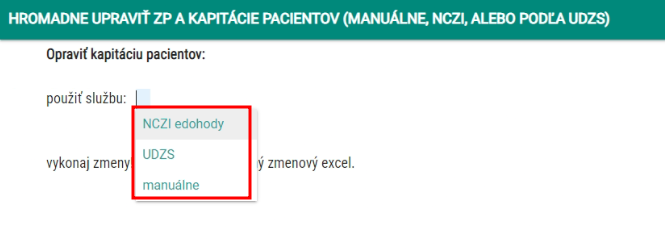 - zobrazia sa možnosti, z ktorých Enterom alebo dvojklikom vyberiete Hromadne upraviť ZP a kapitácie pacientov (manuálne, NCZI, alebo podľa UDZS)