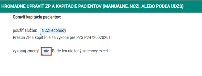 Ak sú údaje v poriadku je nevyhnutné tabuľku zatvoriť (inak zmena ZP neprebehne úspešne), opäť vyvolať nastavenia pre Hromadnú úpravu a v políčku vykonaj zmeny vyberte áno a potvrdíte v pravom dolnom rohu políčkom Vykonať.